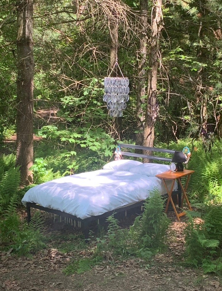 I presented this installation for ‘Art on the Trails’ at Beal’s Preserve, an outdoor exhibition in which spectators walk around a trail and discover artworks. The theme of the exhibition was ‘Marking Territory’ and my piece showcased a bed in nature, questioning the way in which humans try to mark our territory through the idea of the home. This installation explored how the safety of home is a false narrative and a way of shutting out nature when we would be better to embrace it. The bed frame and bed side table was inscribed with a series of poems in the style of children’s nursery rhymes, reflecting the fake tales we tell ourselves about the impermeability of the home.